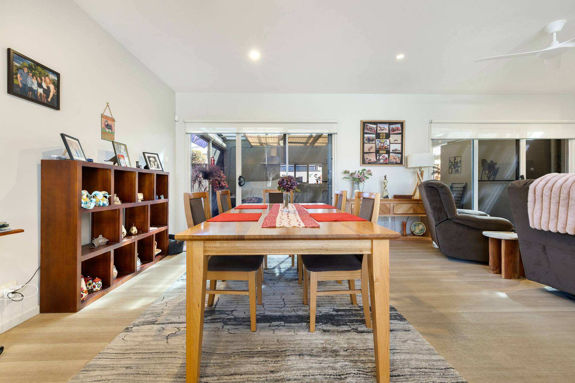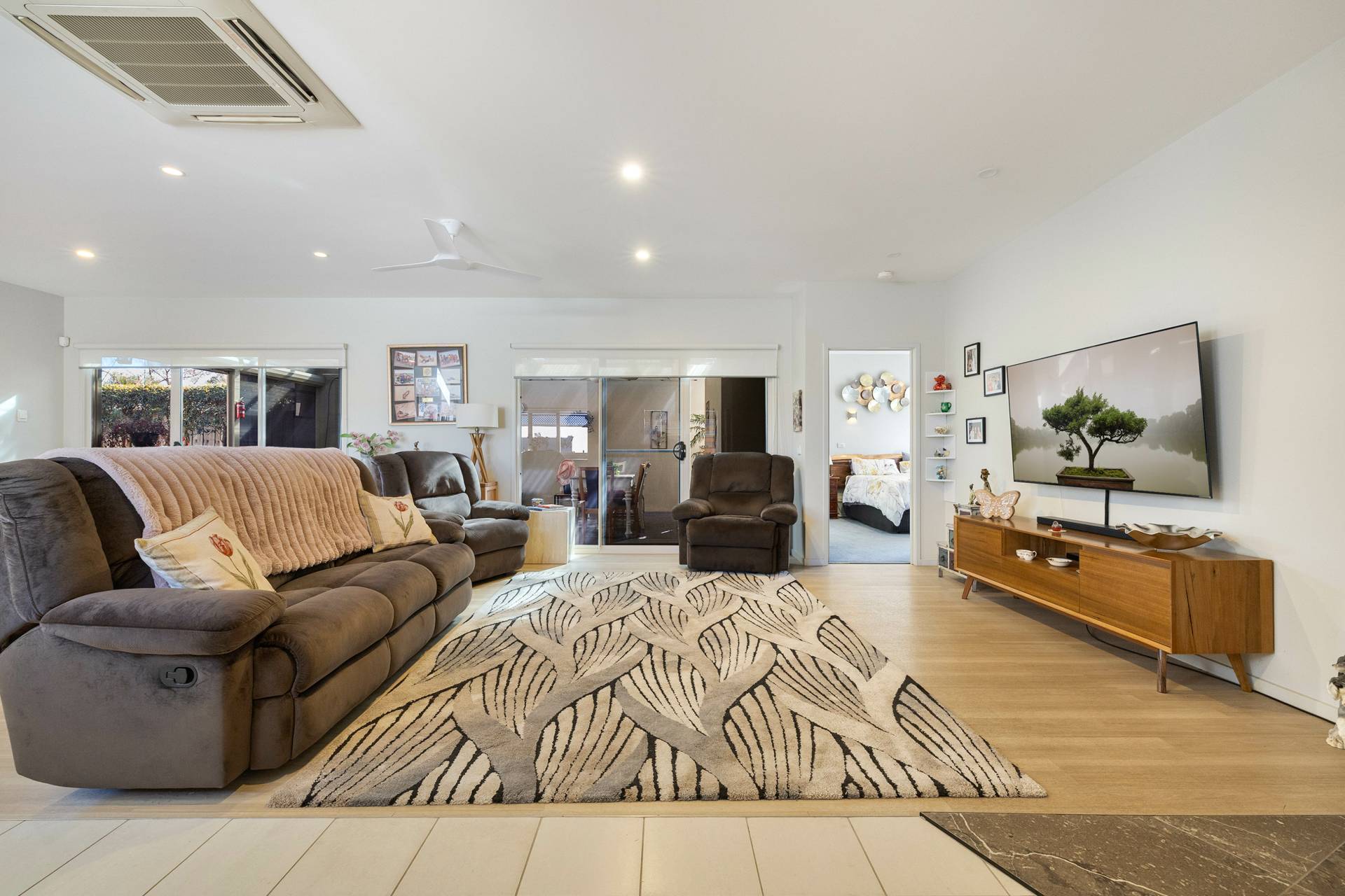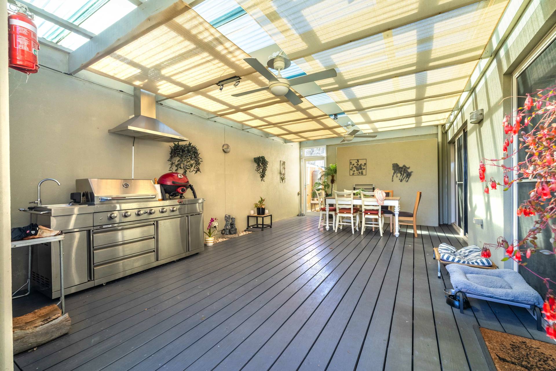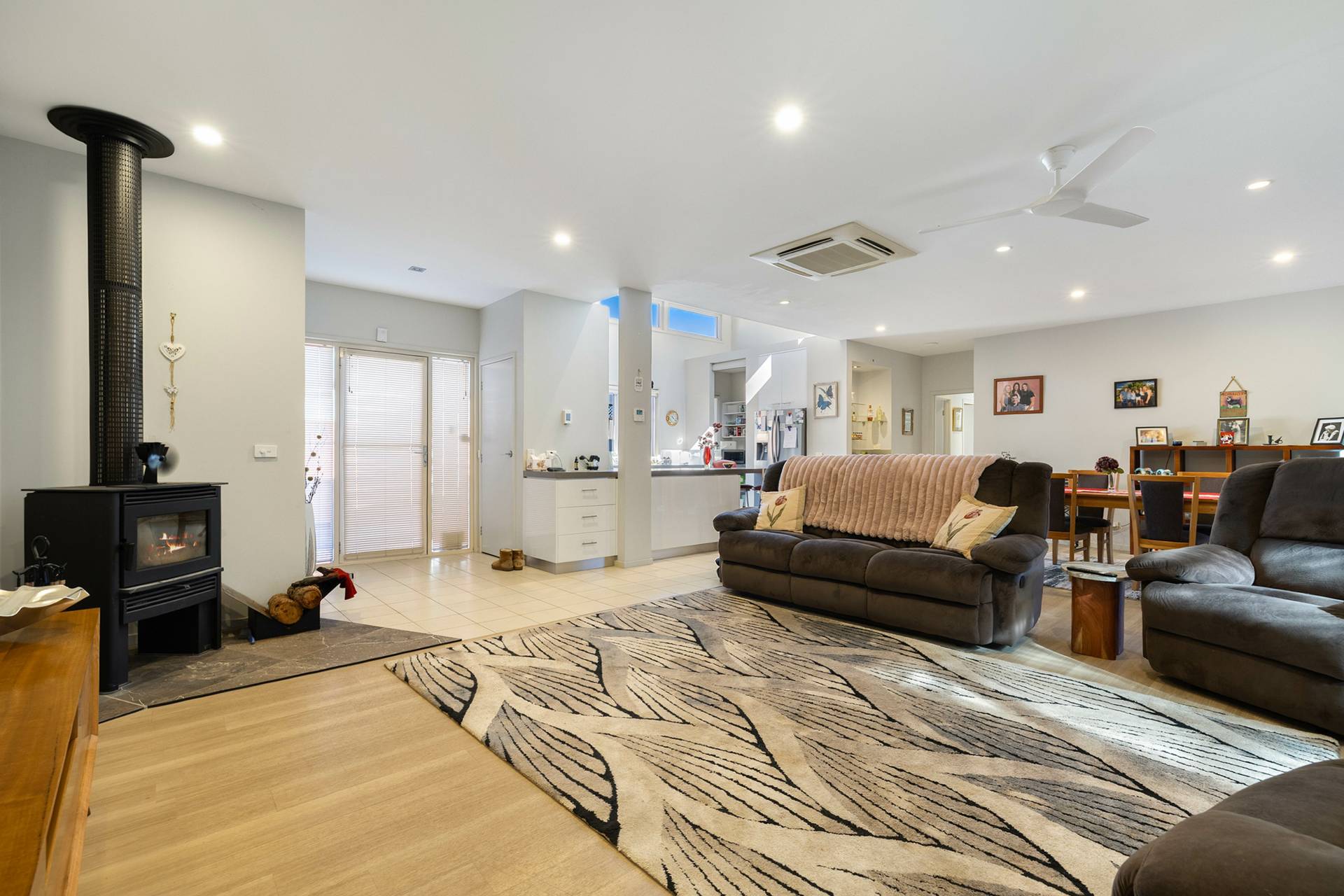 The open-plan living area features a cozy woodfire heater and flows seamlessly to a gorgeous outdoor space that can be fully enclosed with retractable blinds. A lovely space for entertaining all year round, with low-maintenance, established gardens completing the picture.