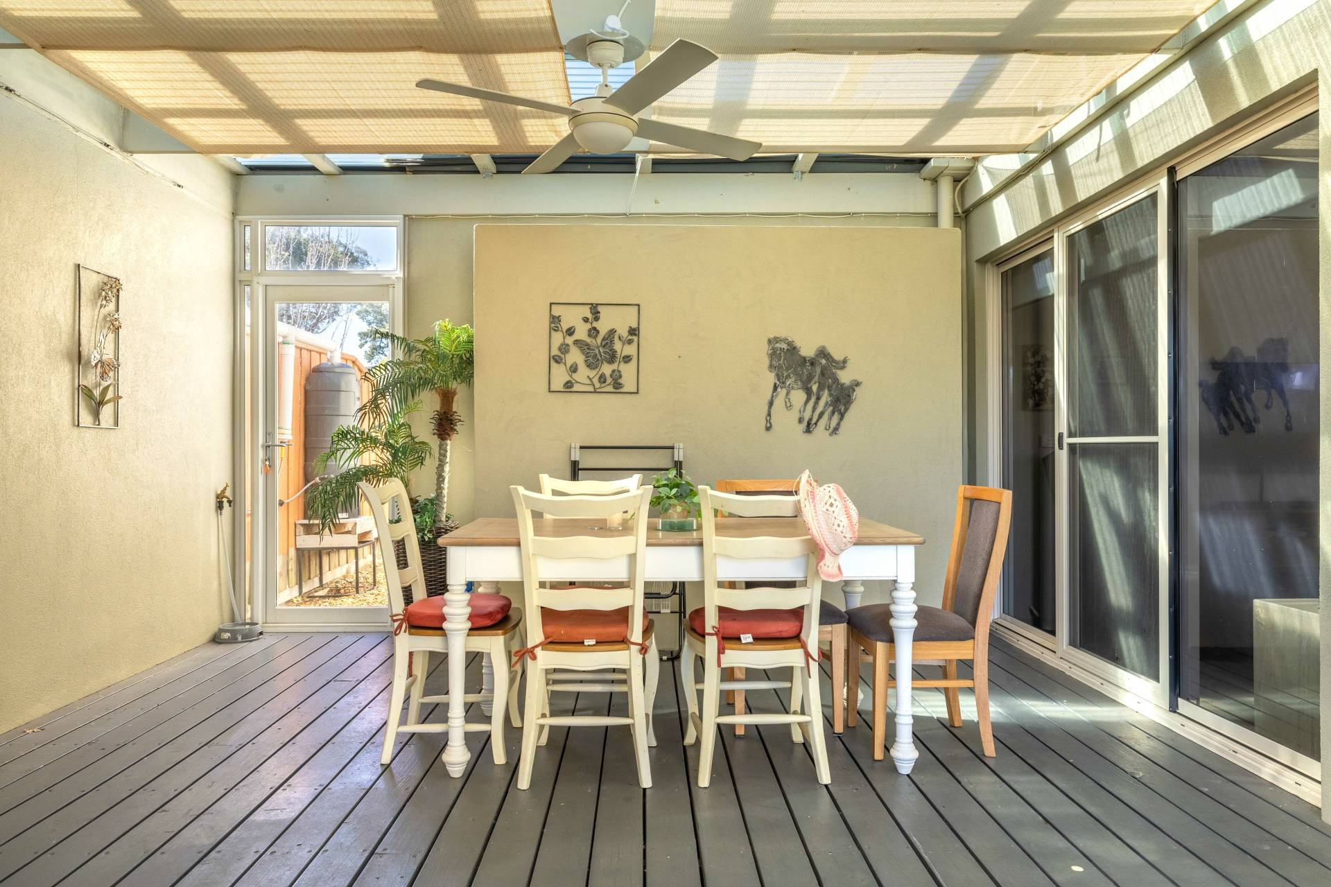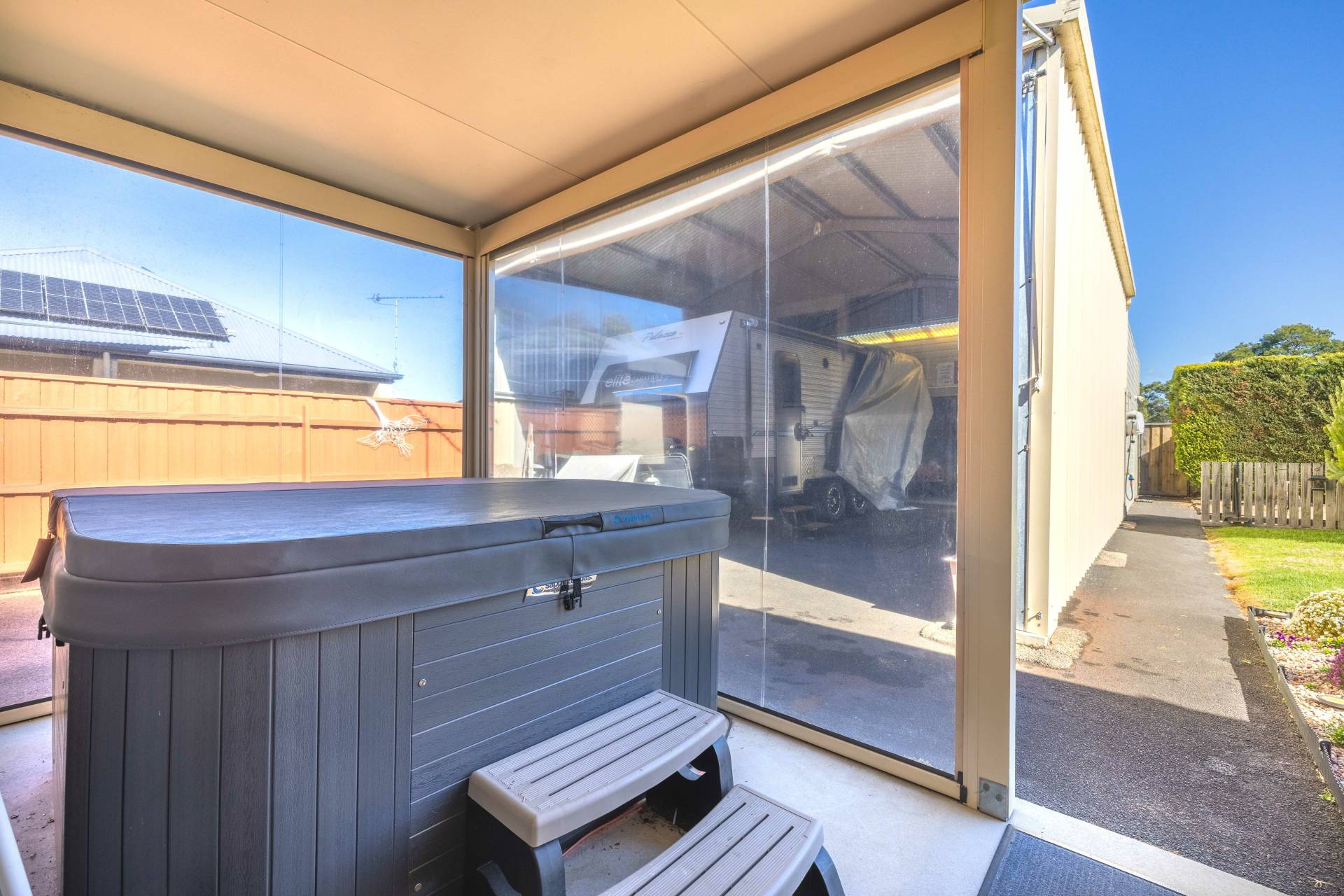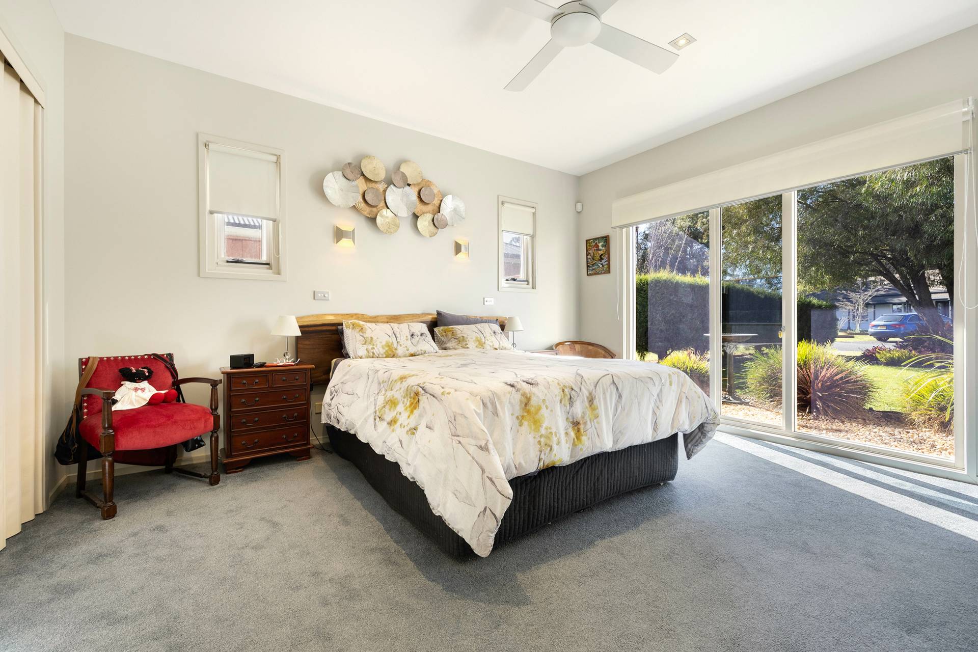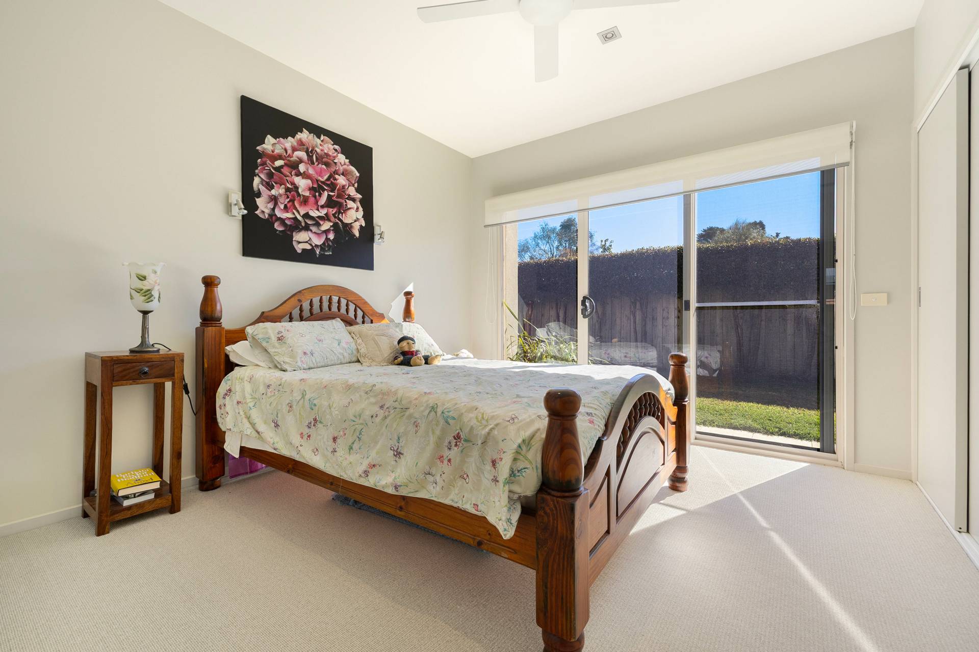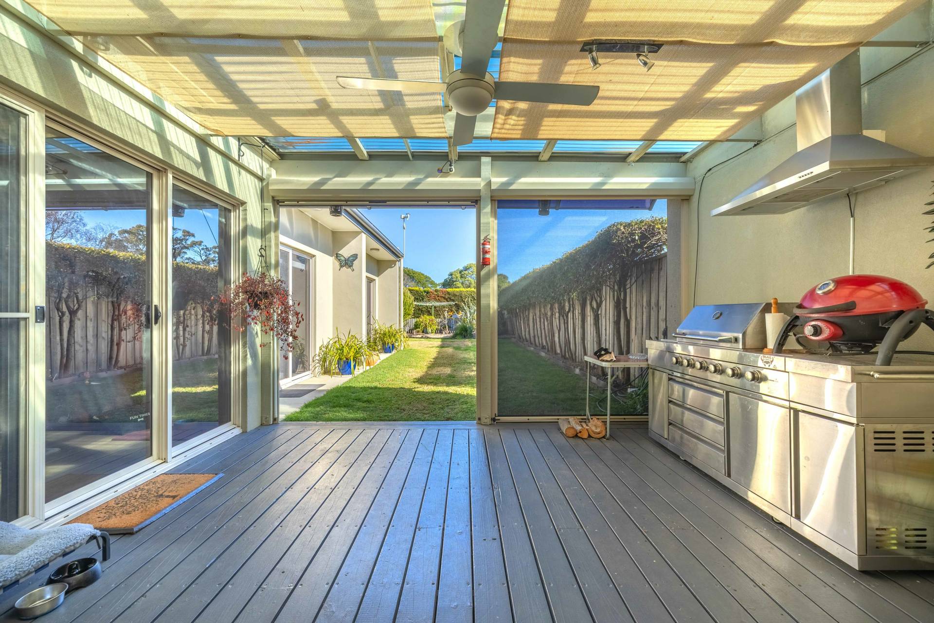 The open-plan living area features a cozy woodfire heater and flows seamlessly to a gorgeous outdoor space that can be fully enclosed with retractable blinds. A lovely space for entertaining all year round, with low-maintenance, established gardens completing the picture.