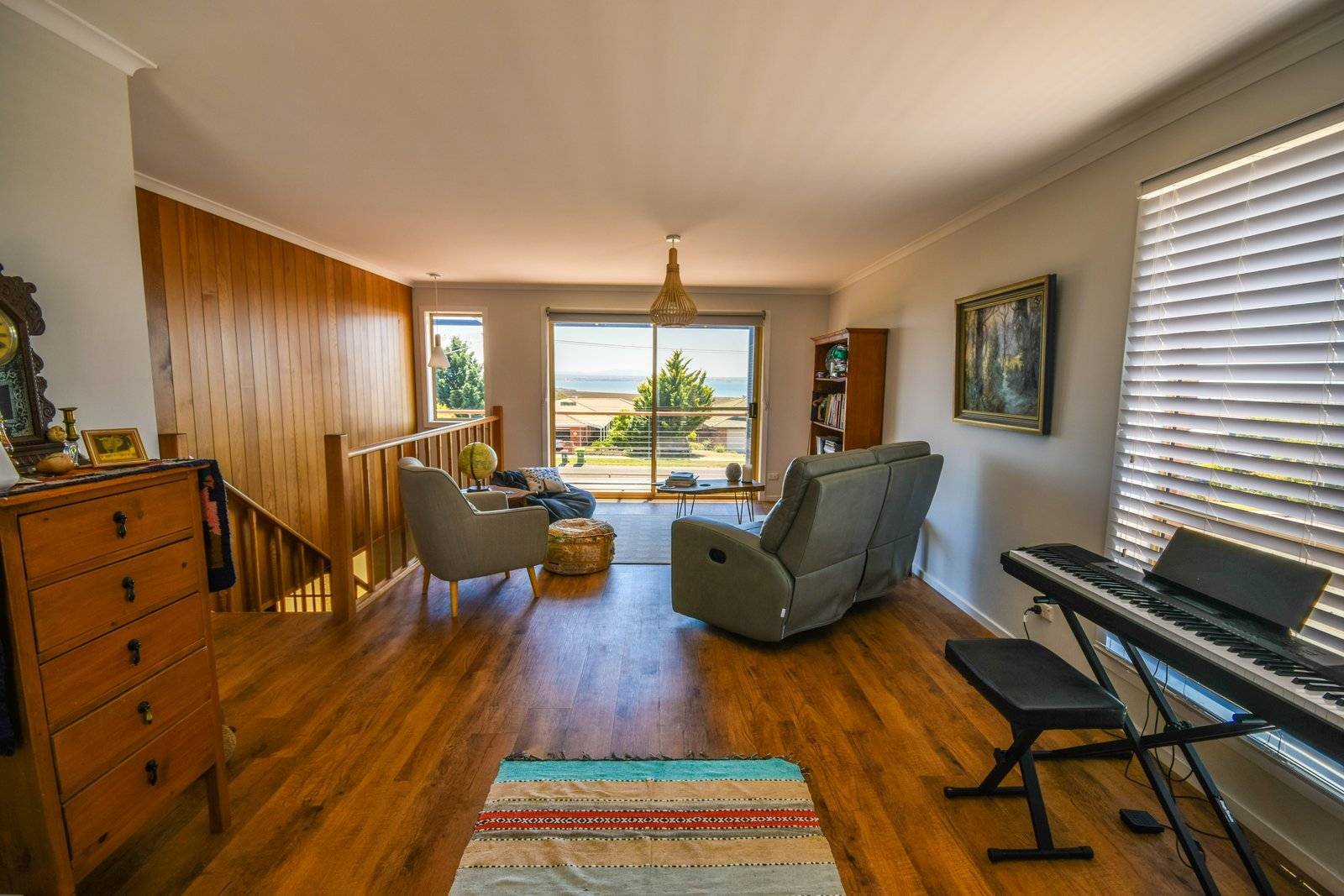 Situated on an elevated allotment facing north with Lake King, Mitchell River Silt Jetties and mountain views that are seen from the lounge, dining/kitchen and main bedroom. This double storey home consists of an upstairs space of two separate living areas, new kitchen, dining and main bedroom with luxurious ensuite. The new kitchen has top of the range appliances including a Belling stove with 7 hotplates and 4 ovens.